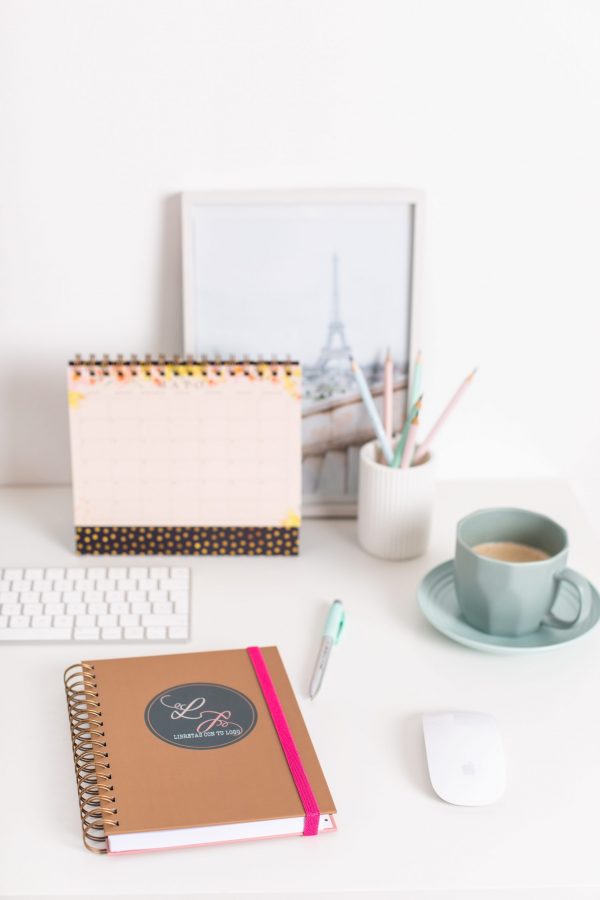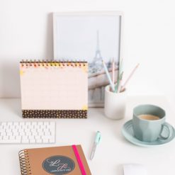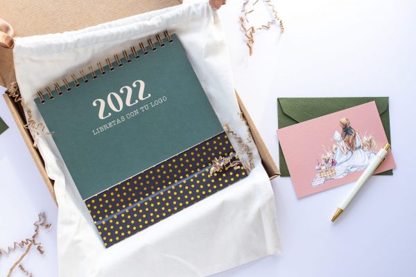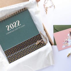 Soporte del calendario forrado en cartón de 2mm, con papel laminado mate y lunares dorados. Wire-o cobre.